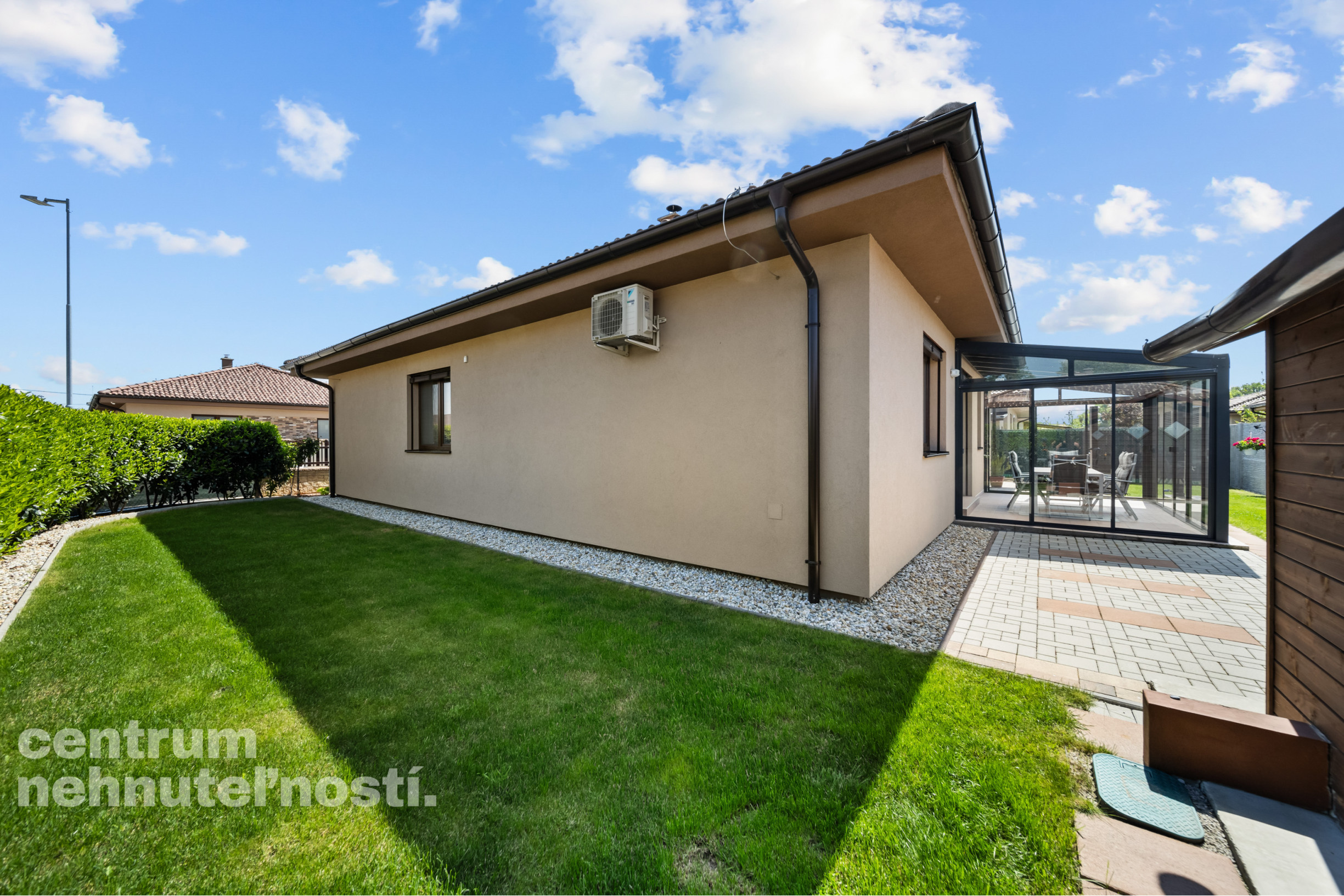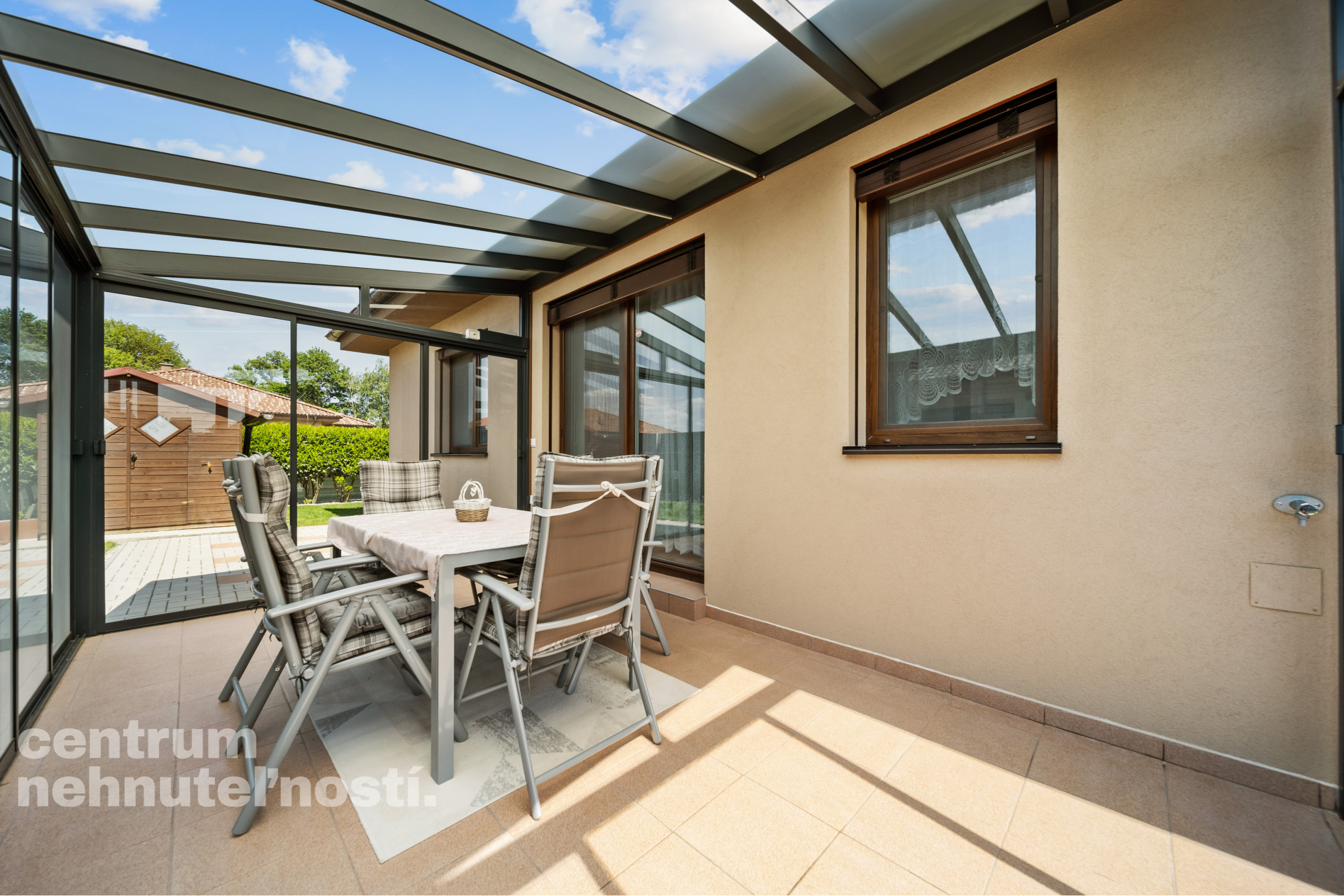 Krytá presklená terasa – ideálne miesto na letné večere, posedenia s rodinou a priateľmi, alebo na relax po náročnom dni. Zasklenie vám umožňuje využívať tento priestor počas celého roka, aj keď počasie nie je ideálne.